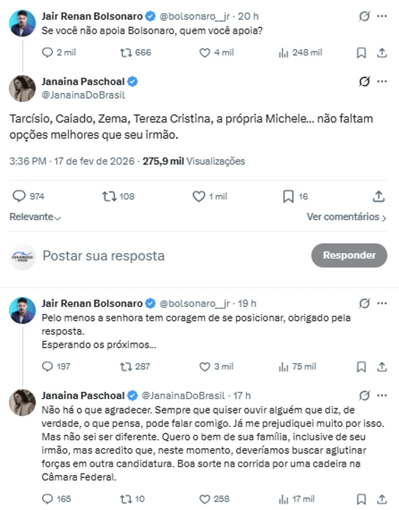 Jair Renan respondeu agradecendo e afirmou: “Pelo menos a senhora tem coragem de se posicionar”. Janaína declarou desejar “o bem da família” Bolsonaro, mas defendeu a construção de uma alternativa neste momento: “Acredito que deveríamos buscar aglutinar forças em outra candidatura”.